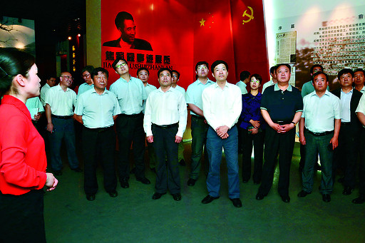 5月24日,在蘭考縣焦裕祿同志紀(jì)念館內(nèi),市委書記魏小東(前排右三)、市長(zhǎng)范修芳(前排右四)等認(rèn)真聆聽(tīng)講解員的講解。